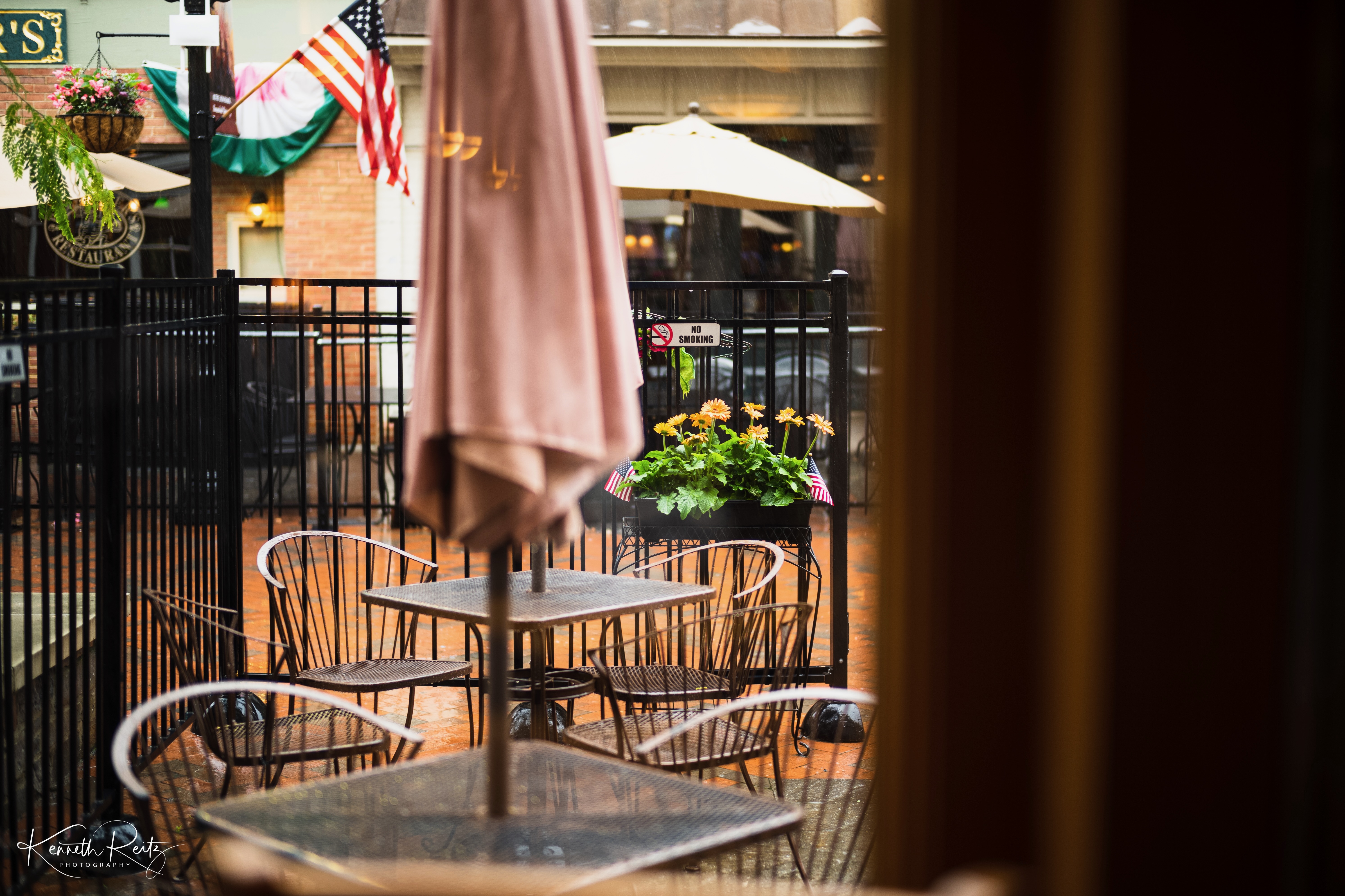Through a rain-streaked window, a quiet outdoor café emerges, its empty tables surrounded by vibrant flowers and flags. The soft lighting creates a reflective mood, enhancing the cozy yet melancholic atmosphere. The protective umbrella casts a gentle shadow, inviting thoughts of warmth against the dreary backdrop.