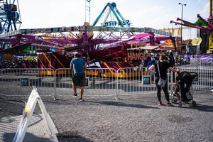 A vibrant carnival scene captures an atmosphere of anticipation as visitors stand before the colorful rides, their bright hues contrasting sharply against the gravel underfoot. The warm sunlight casts playful shadows, enhancing the jovial mood while a child in a stroller eagerly awaits the fun. The composition, with the barrier framing the scene, hints at the barrier between everyday life and the thrilling escapism the fair offers.