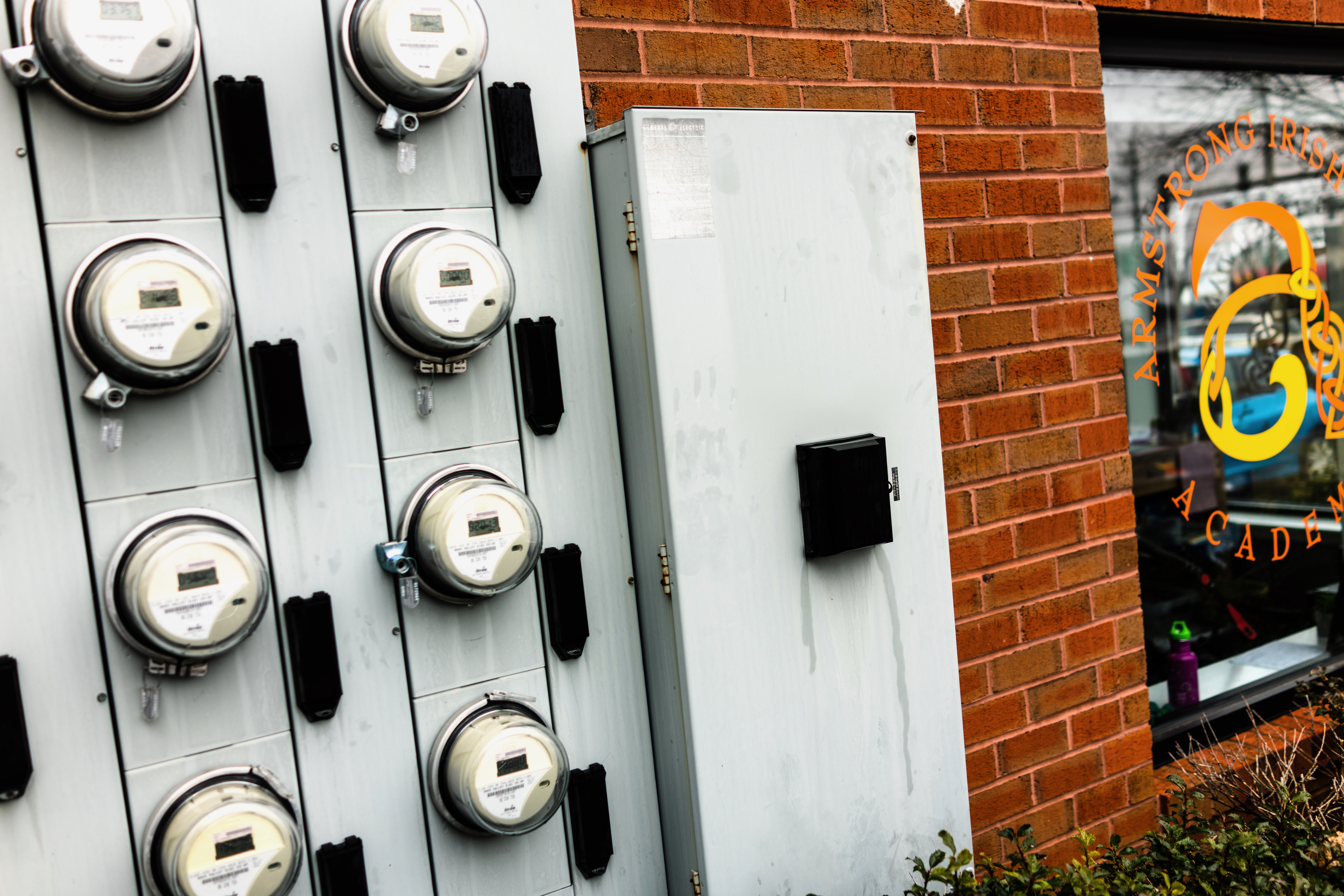 This photograph captures a stark corner of urban infrastructure, featuring rows of electric meters against a warm brick wall. The juxtaposition of cold metal and the vibrant Academy logo in the window adds a contrasting touch of life and color. The muted lighting enhances the functionality of the scene, evoking a sense of quiet resilience in everyday urban landscapes.