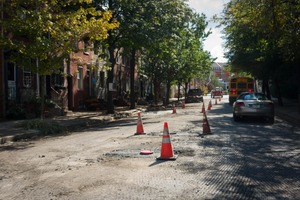 This photograph captures a residential street under construction, marked by orange safety cones and uneven terrain. Bathed in warm daylight, the scene juxtaposes the vibrancy of neighborhood life with the stark interruption of roadwork, evoking a sense of temporary chaos amidst familiar surroundings.