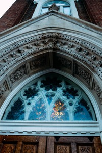 The photograph captures a majestic Gothic arch adorned with intricate carvings, leading to a beautifully detailed stained glass window. Soft, warm light filters through the colorful panes, illuminating the archway and creating a serene and inviting atmosphere. This composition evokes a sense of history and reverence, drawing the viewer's eye upwards to the elegance of the architectural details.