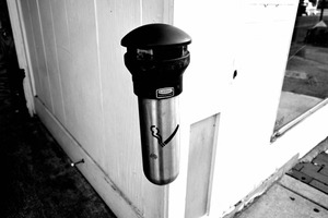 In a monochromatic palette, a stainless steel ashtray hangs almost in solitude against a white wall, evoking a sense of isolation. The stark contrasts of light and shadow create a moody ambiance, highlighting the simplicity of the everyday object. Its presence suggests a narrative of urban life, intertwined with moments of pause and reflection.