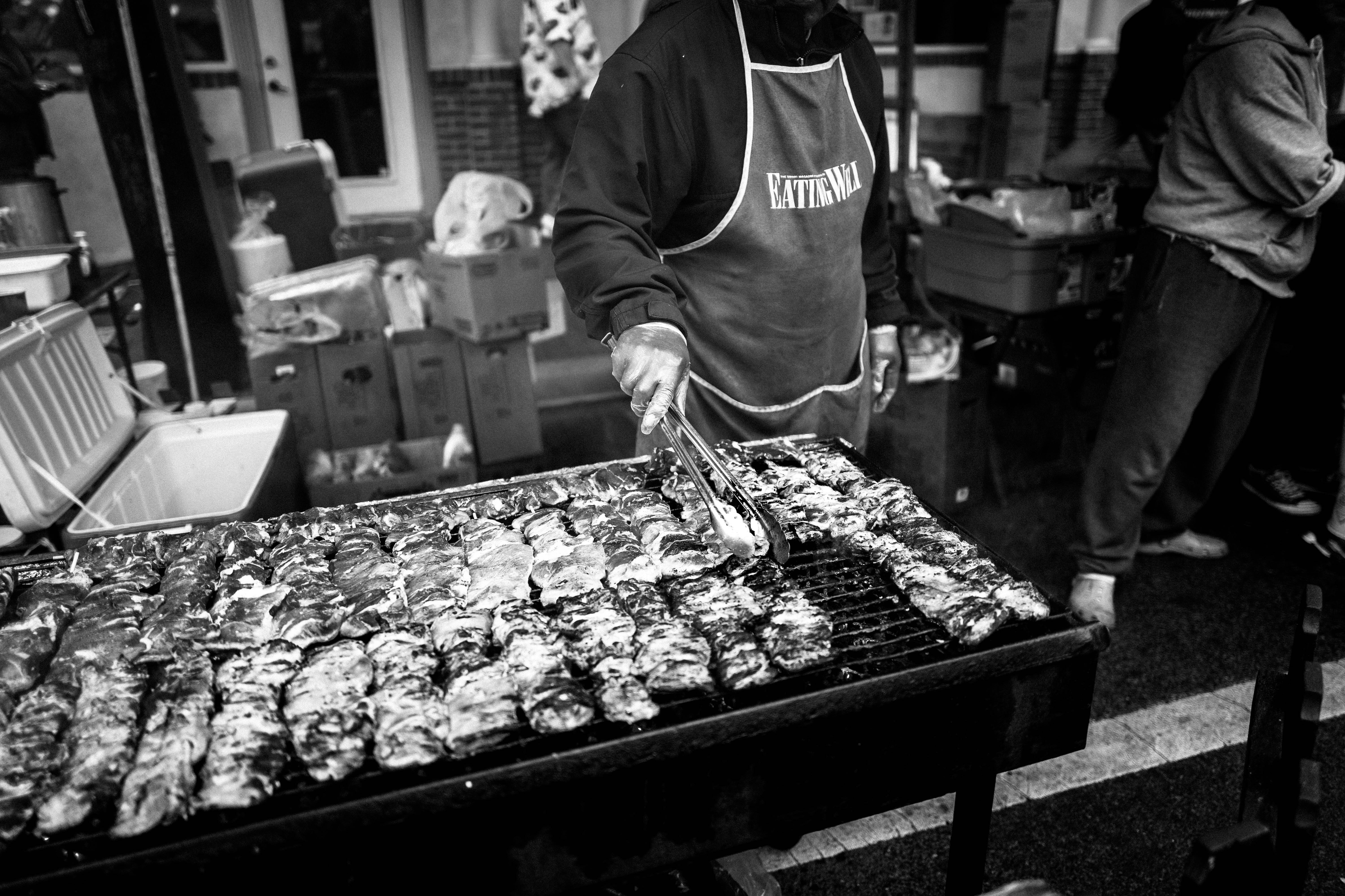 A skilled vendor tends to an array of marinated meats sizzling on a grill, the heat of the fire casting a warm glow amidst the monochrome setting. The focus on the chef's hands and the tongs conveys a sense of dedication, while the surrounding blurriness hints at bustling street life just out of frame. The contrast between the detailed textures of the food and the soft background evokes a rich atmosphere of culinary craft and community.