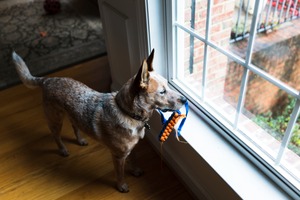 A curious dog stands by a window, gazing intently outside while holding a colorful toy. The soft, natural light illuminates its fur and enhances the cozy, homey atmosphere, contrasted by the vibrant toy. The composition draws the eye from the dog's focused expression to the intriguing scene beyond the glass, evoking a sense of curiosity and anticipation.