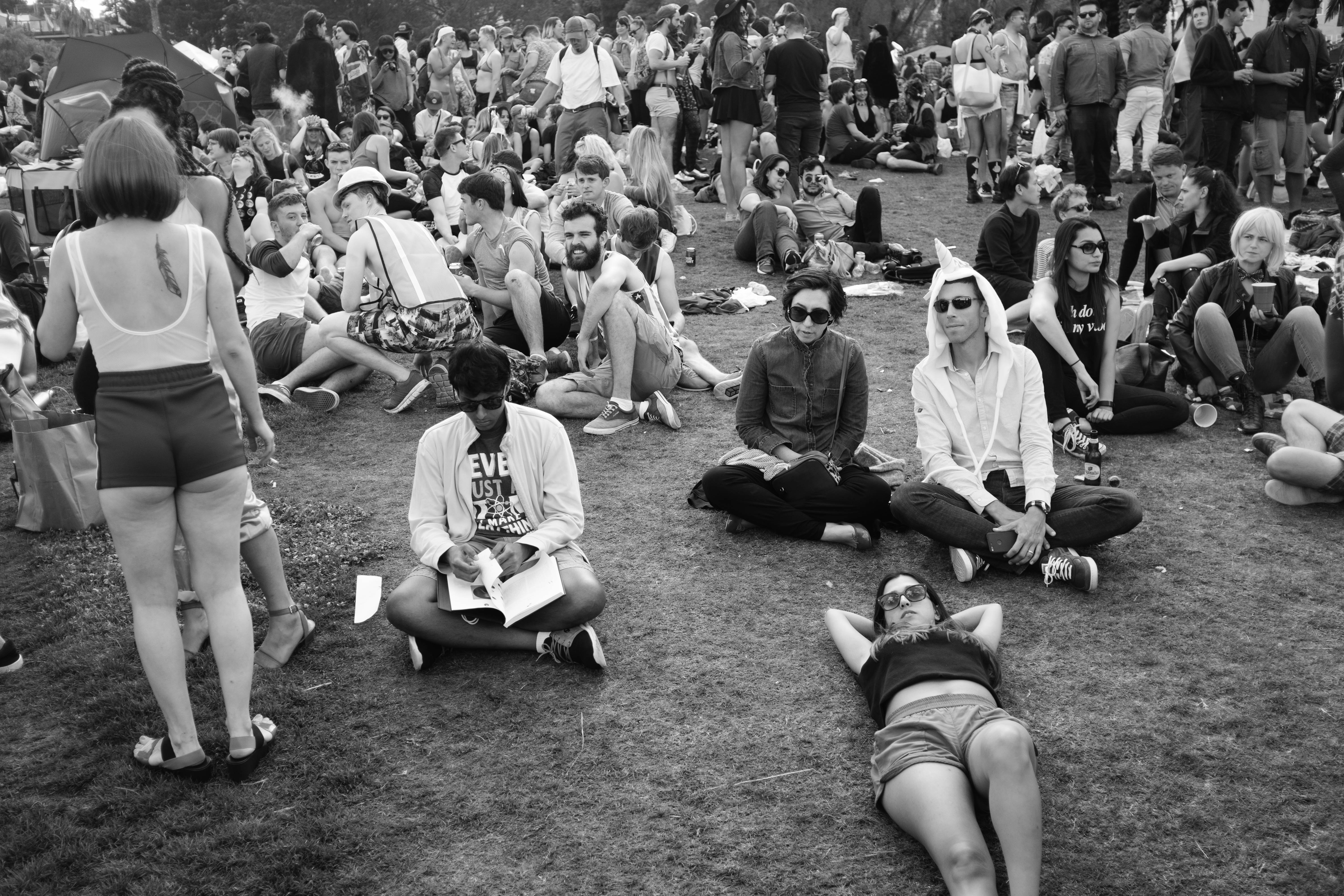 A lively crowd congregates on sun-drenched grass, captured in monochrome tones that highlight the contrasting moods within this vibrant festival scene. Some are animatedly chatting and laughing, while others recline, seemingly lost in thought or relaxation. The layered composition draws the eye across diverse expressions, encapsulating a fleeting moment of communal joy and introspection.