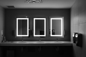 This black-and-white photograph captures a minimalist bathroom scene, centered around three illuminated mirrors that starkly contrast with the muted walls. The lighting creates a serene and introspective mood, inviting contemplation in the otherwise utilitarian space. The simple composition focuses on symmetry and reflection, emphasizing a sense of order and tranquility.