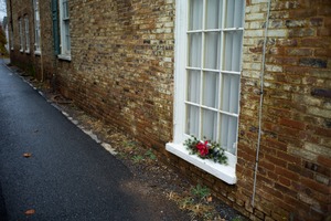 The photograph captures a narrow alleyway lined with aged brick walls, evoking a sense of nostalgia and tranquility. A festive arrangement of greenery and red flowers adorns a white window sill, adding a pop of color amidst the muted tones of the bricks and the damp, reflective pavement. Soft, diffused lighting hints at an overcast day, enhancing the intimate and serene mood of the setting.