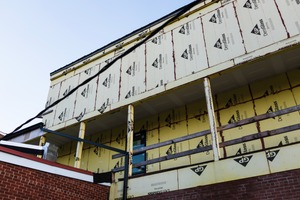The photograph captures a construction site, focusing on a building's partially completed exterior. Bright yellow insulation boards juxtapose with raw wooden beams, creating a stark contrast against the clear blue sky above. The composition evokes a sense of anticipation and transformation, with the framing suggesting both vulnerability and potential.