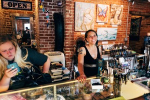 In this warm and inviting scene, the cheerful shopkeeper stands confidently behind the counter, exuding a welcoming presence. The soft lighting creates a cozy atmosphere, highlighting the eclectic array of art on the exposed brick walls. Meanwhile, a distracted customer engrossed in her phone adds a layer of contrast, reflecting the blend of human connection and modern distraction within this vibrant space.
