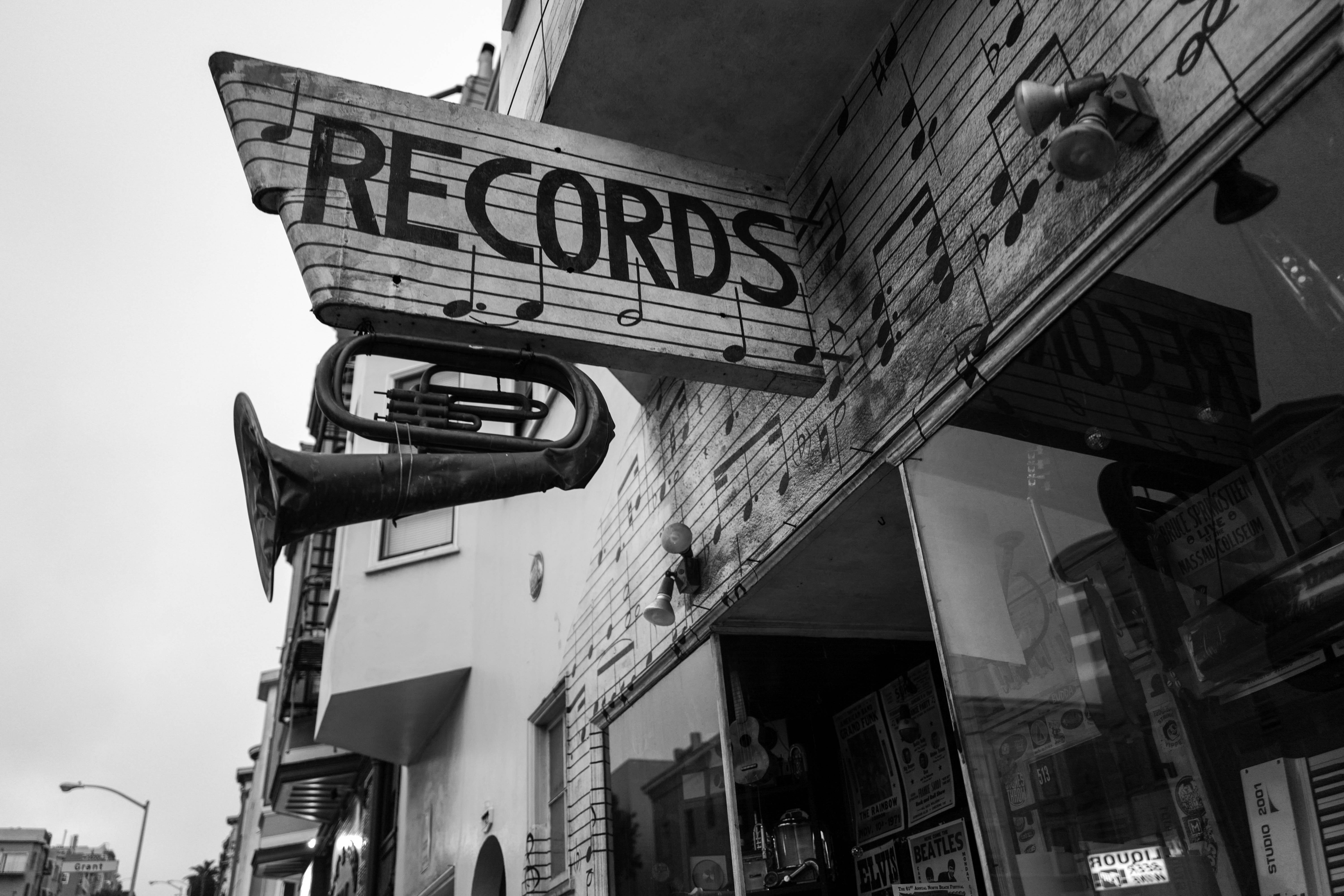 This black-and-white photograph captures a vintage record store sign, adorned with musical notes and a trumpet, evoking a sense of nostalgia and artistic charm. The low angle composition highlights the intricate details of the sign against a softly blurred urban backdrop, while the muted lighting enhances the timeless atmosphere. The scene invites viewers to reminisce about the golden age of music, encapsulating a world of sound and history.