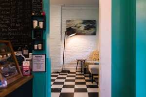 This photograph captures an inviting nook within a café, highlighted by the warm glow of an overhead lamp casting soft light on a patterned chair. The contrasting colors of the walls—bright turquoise and white—add vibrancy to the scene, while the checkerboard flooring creates a playful rhythm. A sense of calm pervades the space, beckoning patrons to pause and enjoy a moment of peaceful solitude.