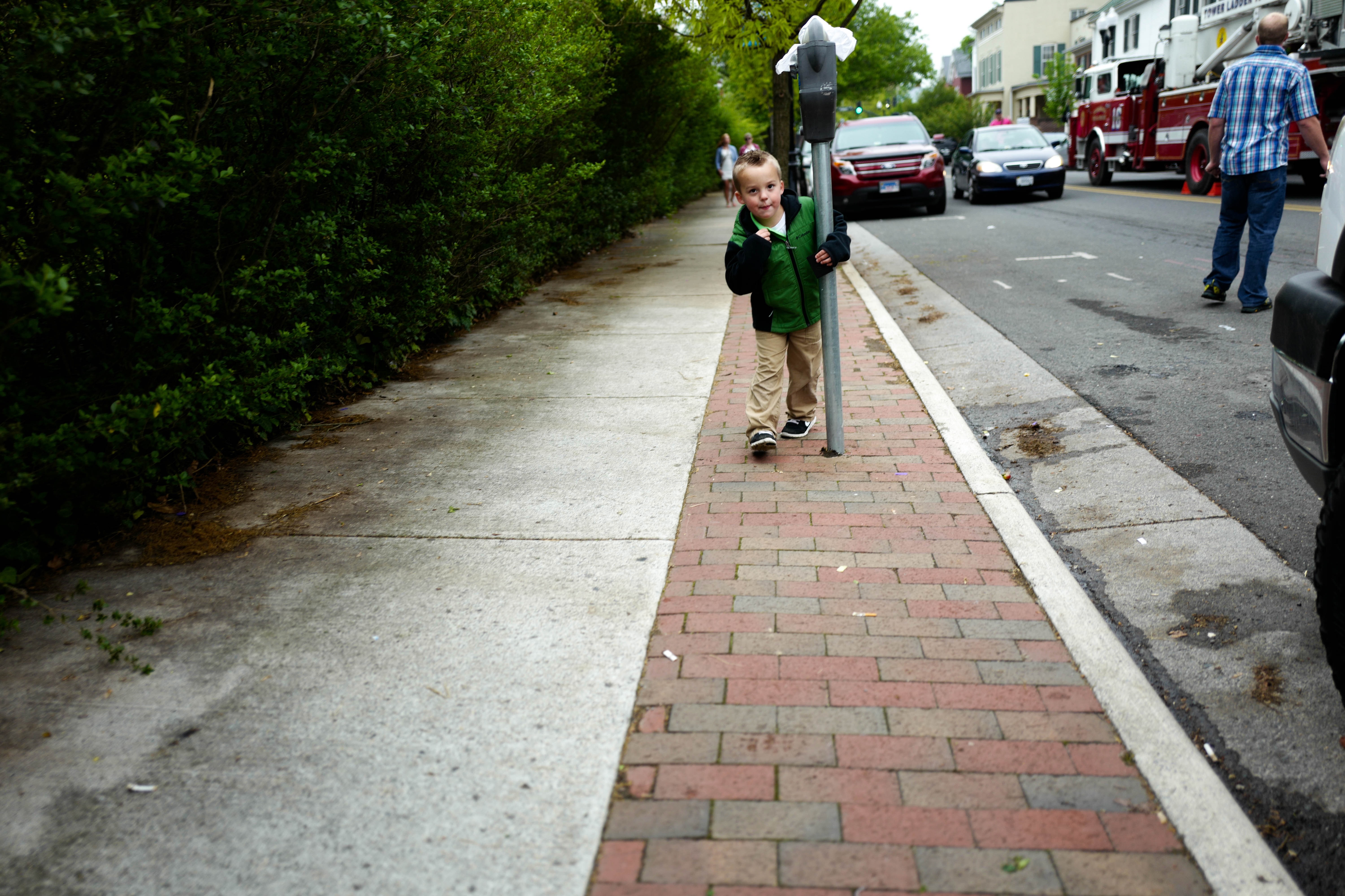 This photograph captures a young boy playfully leaning against a parking meter, exuding innocence and curiosity. Surrounded by greenery and bustling activity, the composition contrasts the vibrant child with the muted tones of the urban scene. Soft, diffused natural light enhances the mood, creating a sense of joy in a lively environment.