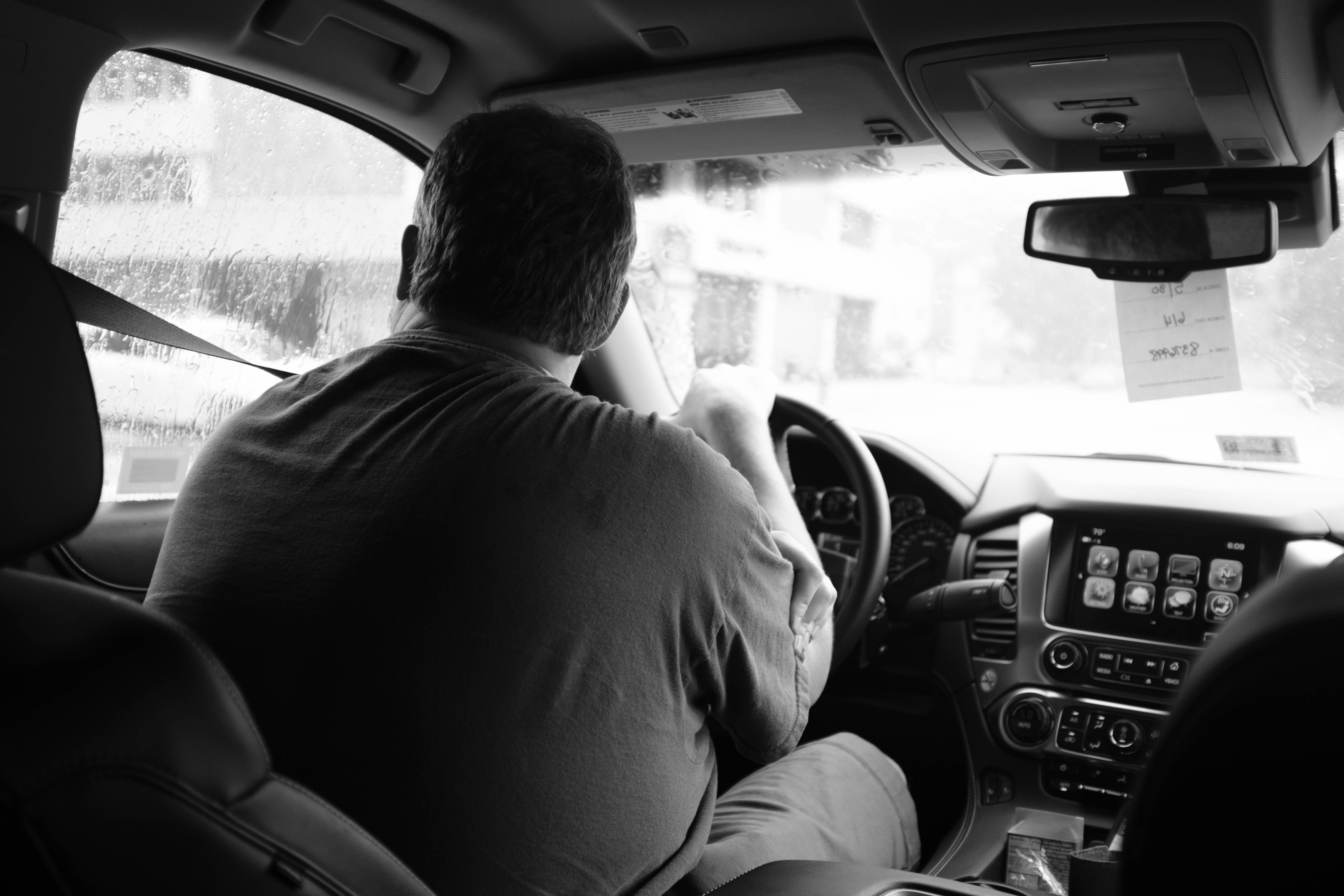 This intimate black-and-white photograph captures a man seated in a car, gazing out at the rainy scene beyond the windshield. The mood is contemplative, enhanced by the soft, diffused light filtering through raindrops that blur the outside world. The composition features the man in profile, emphasizing his solitude against the bustling backdrop of a rainy day.