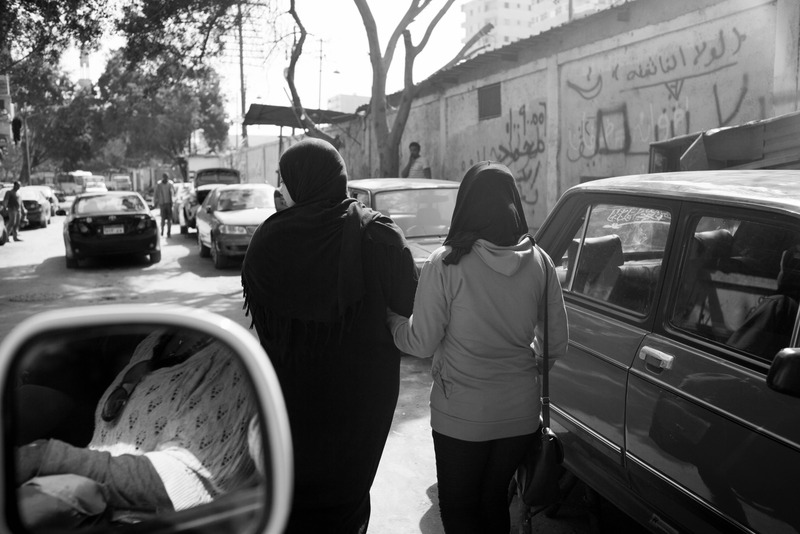 In this striking black and white photograph, two women walk closely together, their silhouettes framed by a busy street scene filled with cars and urban elements. The composition emphasizes their bond against a backdrop of daily life, with dappled sunlight filtering through trees, creating a contemplative mood. The contrast between light and shadow enhances the intimacy of their connection amidst the chaos of the city.