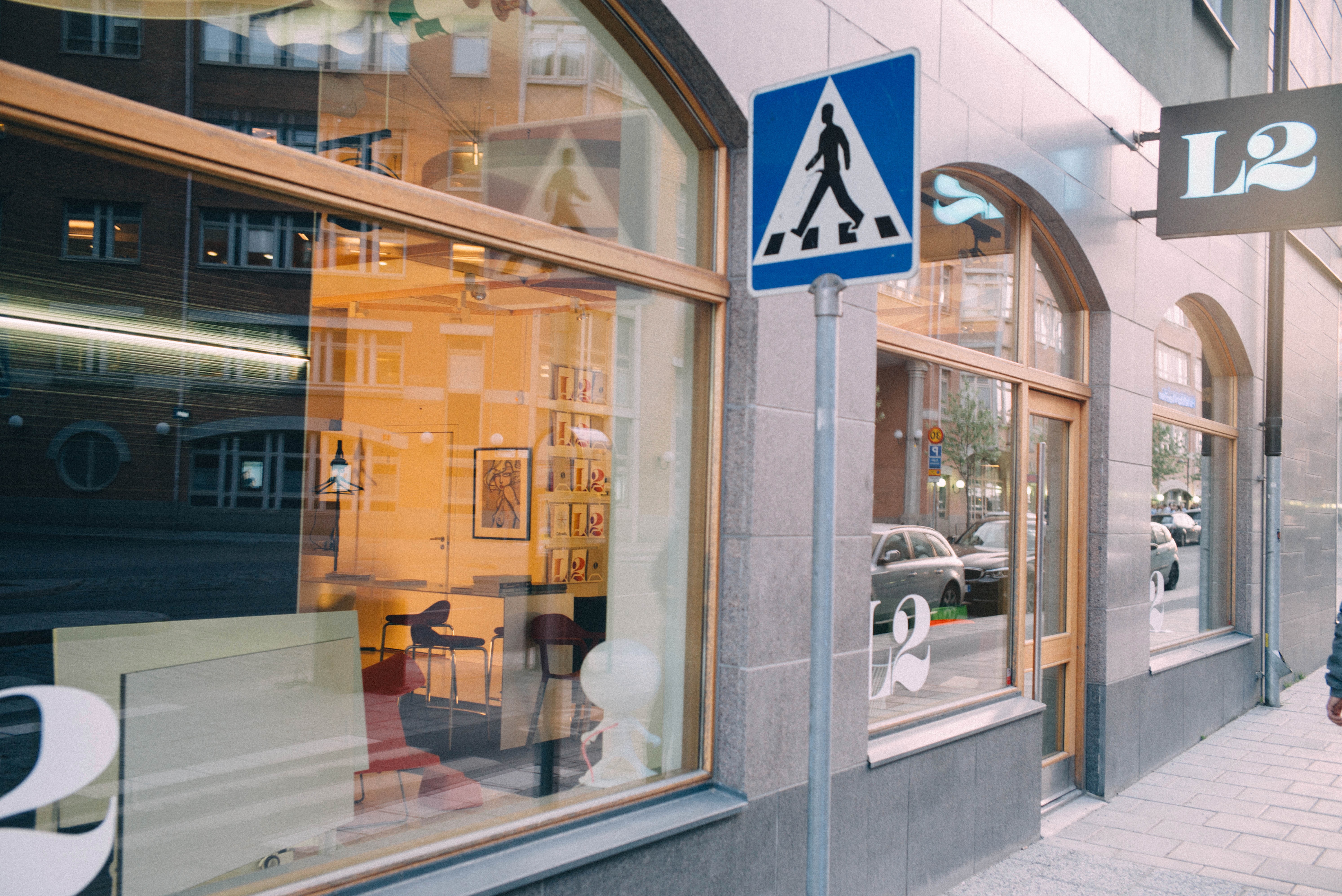 This photograph captures the inviting exterior of a contemporary space with large windows that reflect the surrounding urban environment. The warm interior lighting contrasts with the cool hues of the street, creating a sense of warmth and intimacy amidst the bustling city. A pedestrian sign stands prominently, guiding visitors and enhancing the urban vibe of the scene.