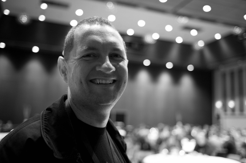 The photograph captures a man smiling brightly, positioned in the foreground against a blurred crowd in the background. The contrast of black and white enhances the cheerful mood, with soft lighting illuminating his face and creating a sense of warmth in the spacious venue. This composition invites the viewer to share in the moment of delight amidst the gathering ambiance.