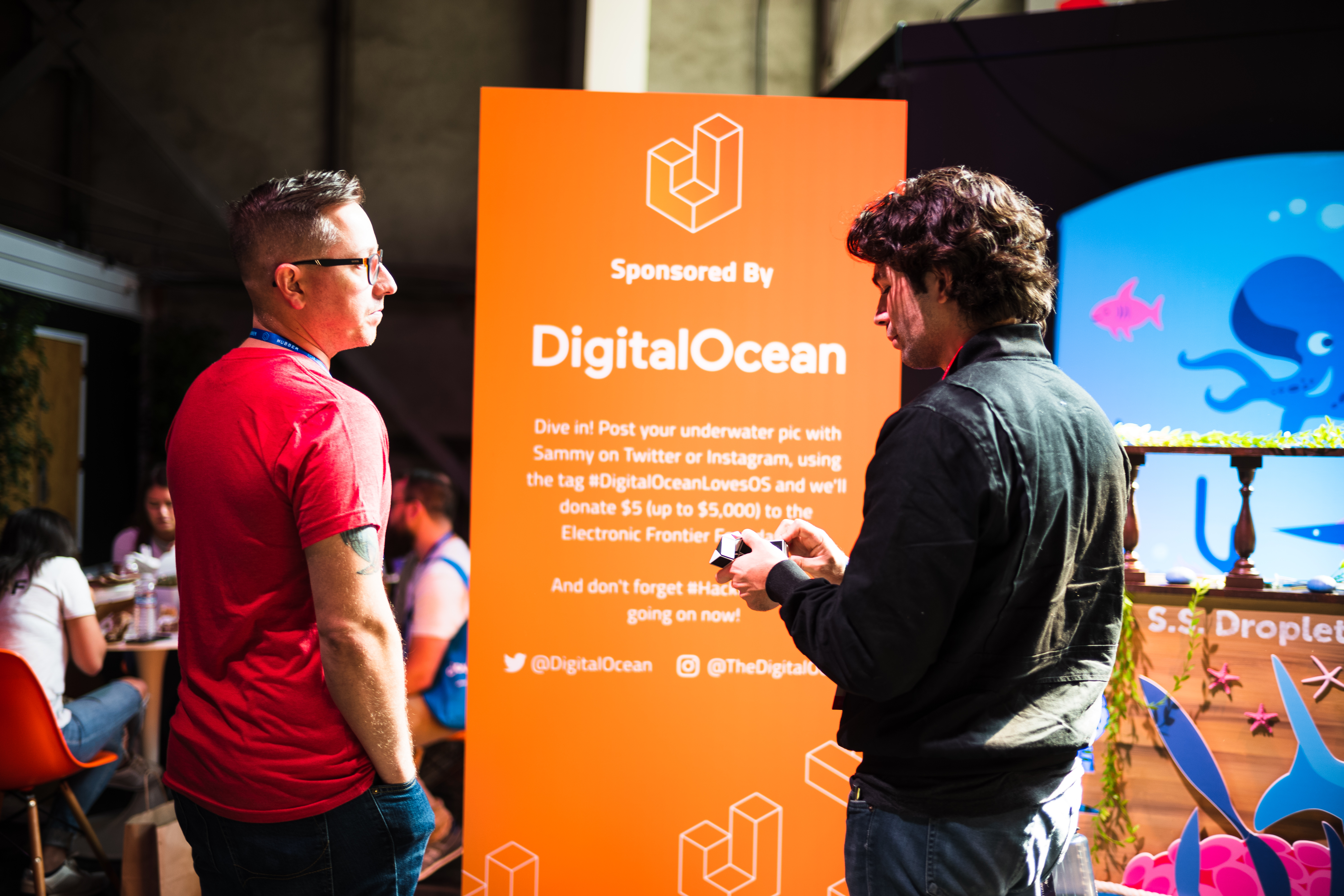 In a vibrant, well-lit setting, two individuals engage in conversation near a vivid orange backdrop sponsored by DigitalOcean. The warm, inviting atmosphere exudes enthusiasm and creativity, enhanced by a colorful display evocative of underwater themes, suggesting a creative and collaborative environment.