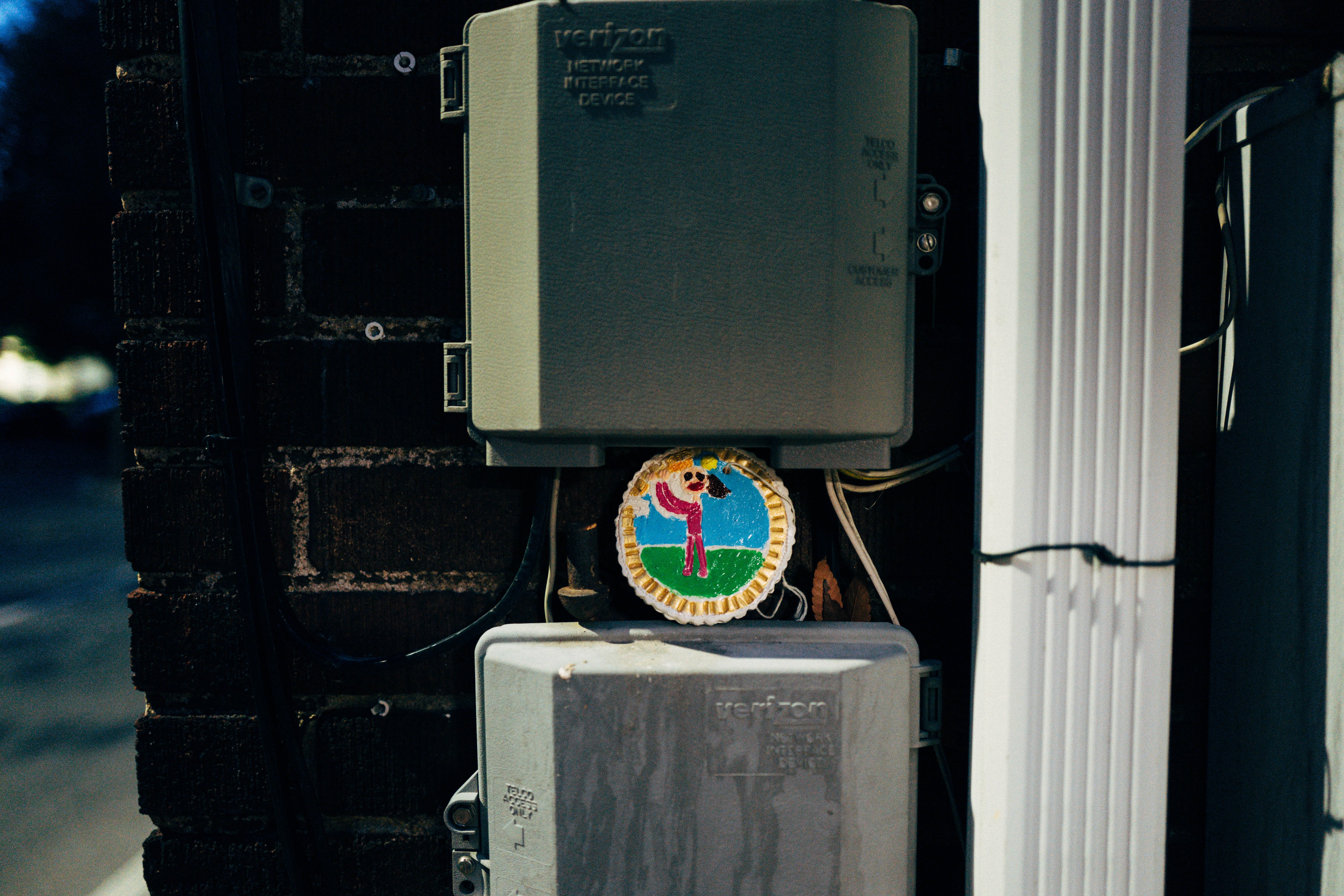 Nestled among the utilitarian gray boxes, a vibrant hand-drawn decoration draws the eye—its cheerful colors standing out against the austere backdrop of technology. The muted lighting evokes a sense of urban stillness, creating a juxtaposition between the lively artwork and the harsh, mechanical surroundings. This unexpected burst of creativity subtly invites viewers to find beauty in the overlooked corners of city life.