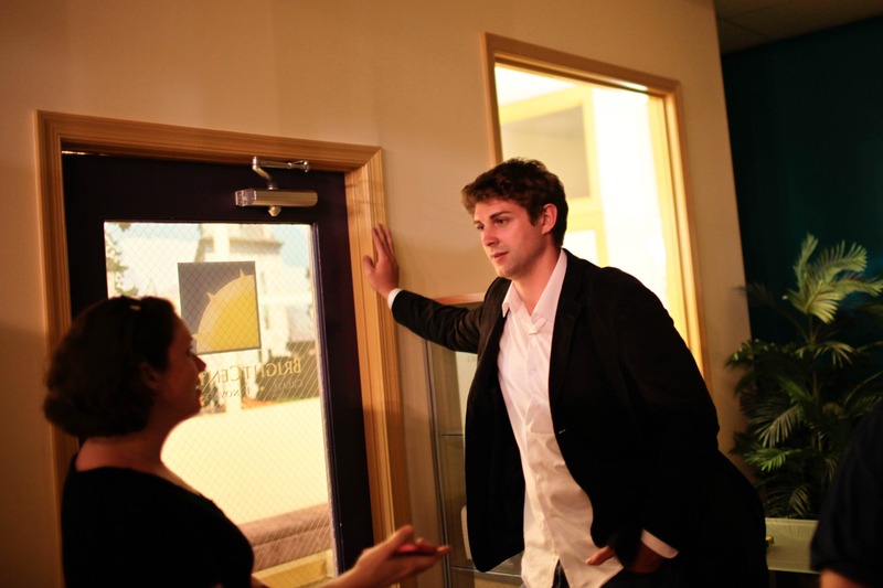 In a warmly lit interior, a young man leans casually against a wall, engaged in conversation with a woman. The soft glow illuminates their faces, suggesting an intimate exchange, while the relaxed posture of the man contrasts with the slightly tense anticipation of the moment, creating a mood of connection and curiosity.