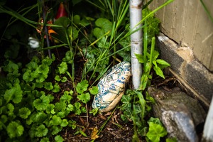 Nestled among lush green foliage, a uniquely painted stone captures attention with its whimsical designs. Soft, natural lighting highlights the textures of the rock and surrounding plants, imbuing the scene with a tranquil, secretive atmosphere. The composition draws the eye to the stone, creating a sense of discovery in this secluded garden nook.