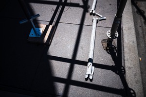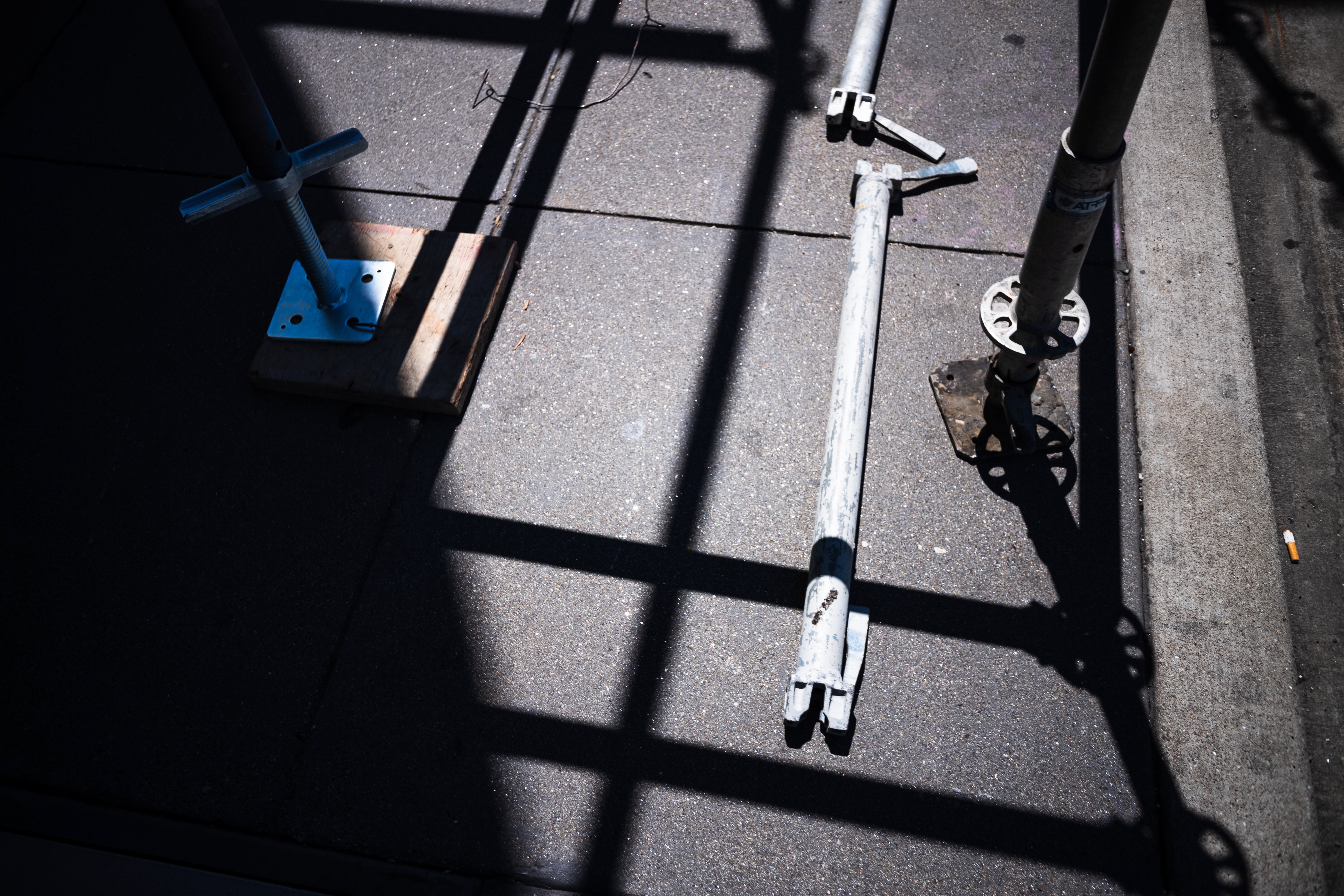 This photograph captures a sparse scene of construction materials scattered across a pavement, illuminated by stark sunlight that casts dramatic shadows. The interplay of light and shade creates a mood of tension and abstraction, as industrial elements are framed by angular lines and geometric forms. The minimalist composition invites contemplation on the beauty found in everyday architecture and the transient nature of urban environments.