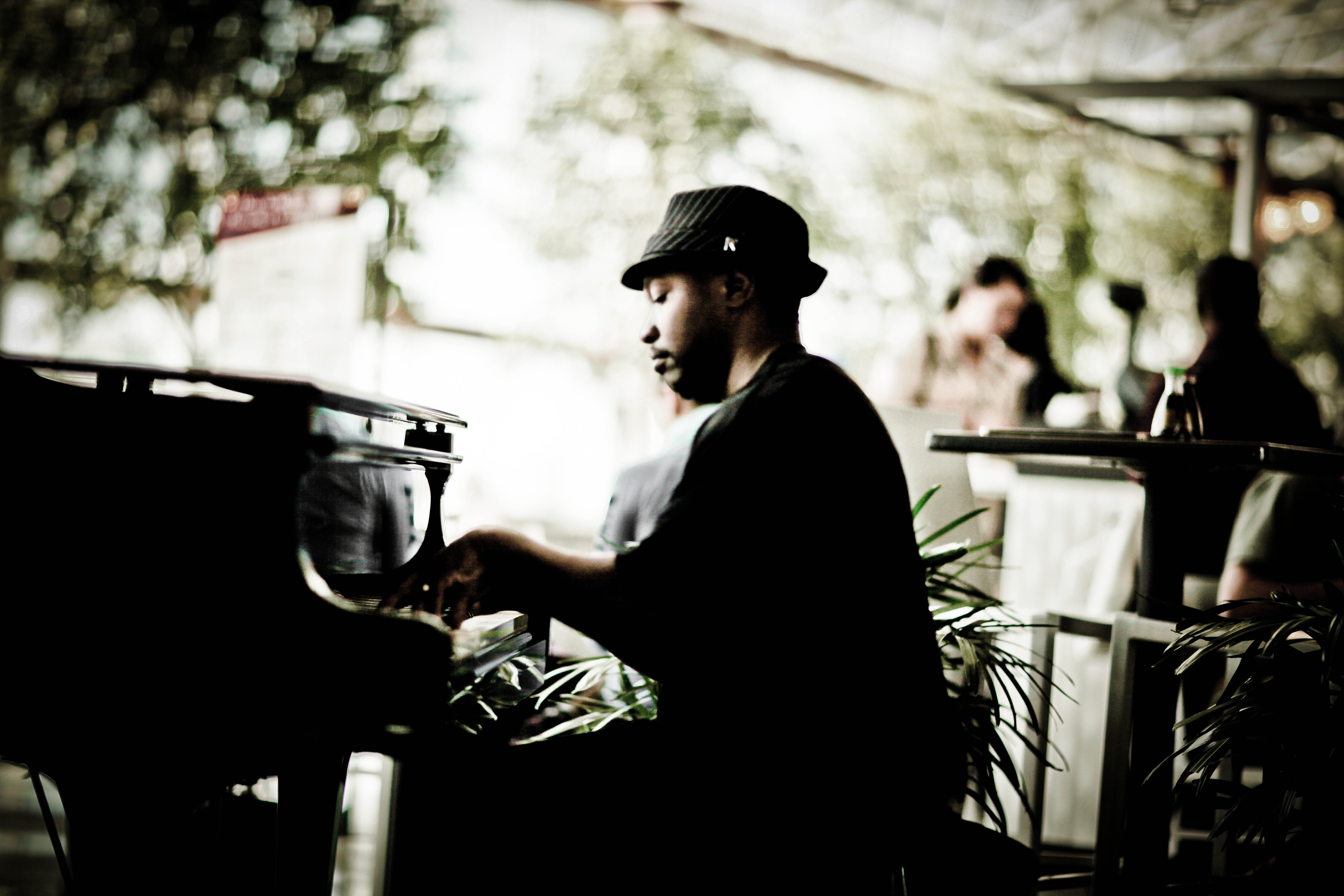 A solitary pianist captures the essence of a bustling cafe, immersed in a moment of graceful concentration. The warm, diffused lighting creates a serene atmosphere, enhancing the soft blur of the background where patrons enjoy their own conversations. Framed by lush greenery, the scene melds artistry and casual elegance, inviting viewers to feel the music's subtle rhythms in the air.