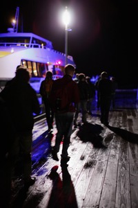 The photograph captures a group of silhouetted figures walking along a wet wooden dock, illuminated by a bright overhead light. The ethereal glow casts long shadows, creating a sense of movement and anticipation as the passengers approach the waiting boat. The mood is both mysterious and reflective, underscored by the contrasting dark night sky and the vibrant hues of the lighting.