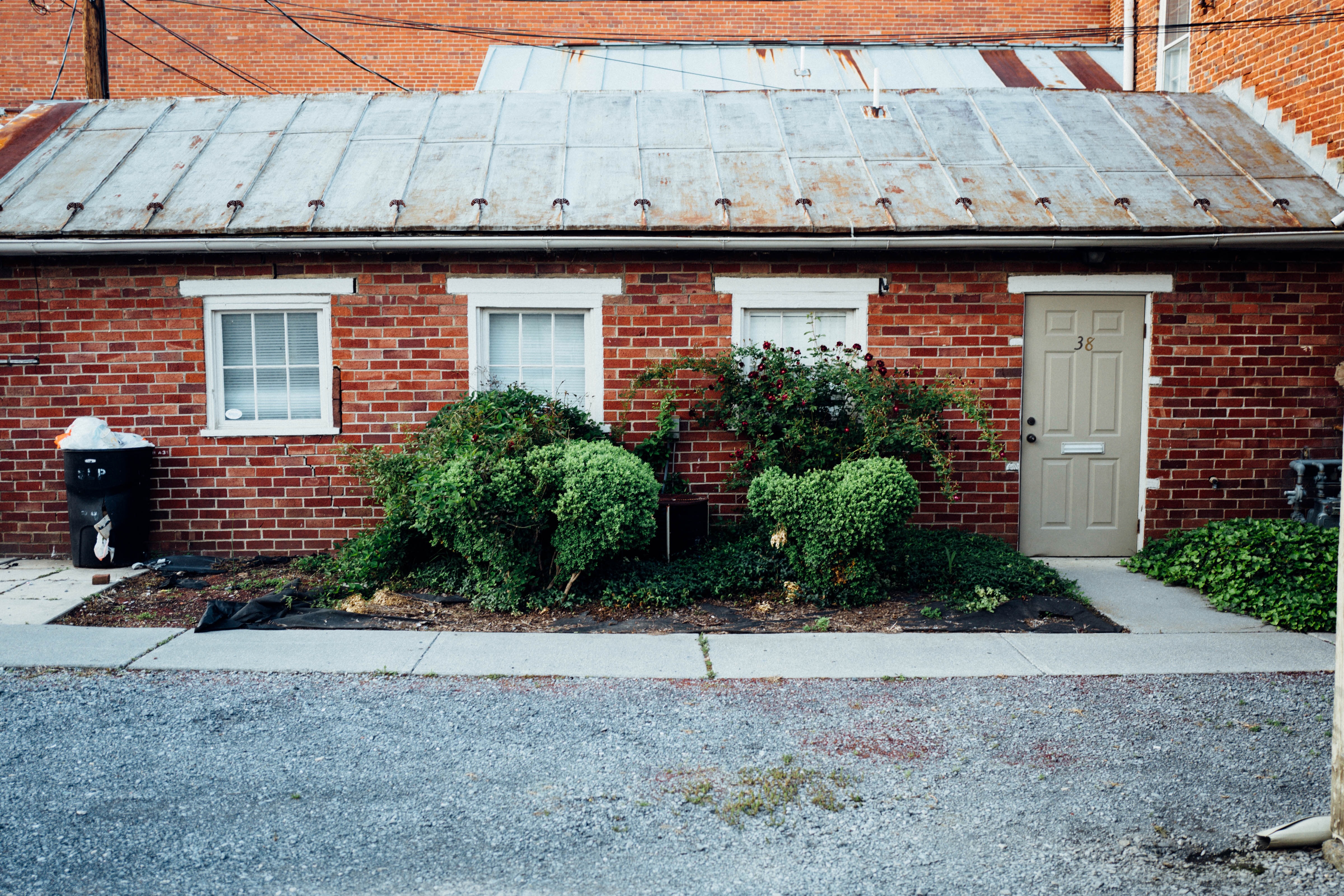 This photograph captures a quaint brick building nestled in an urban alley, softened by lush greenery that partially obscures its facade. The warm, diffused light enhances the rustic charm and peaceful mood, while the contrasting textures of the brick and metal roof add depth to the composition.