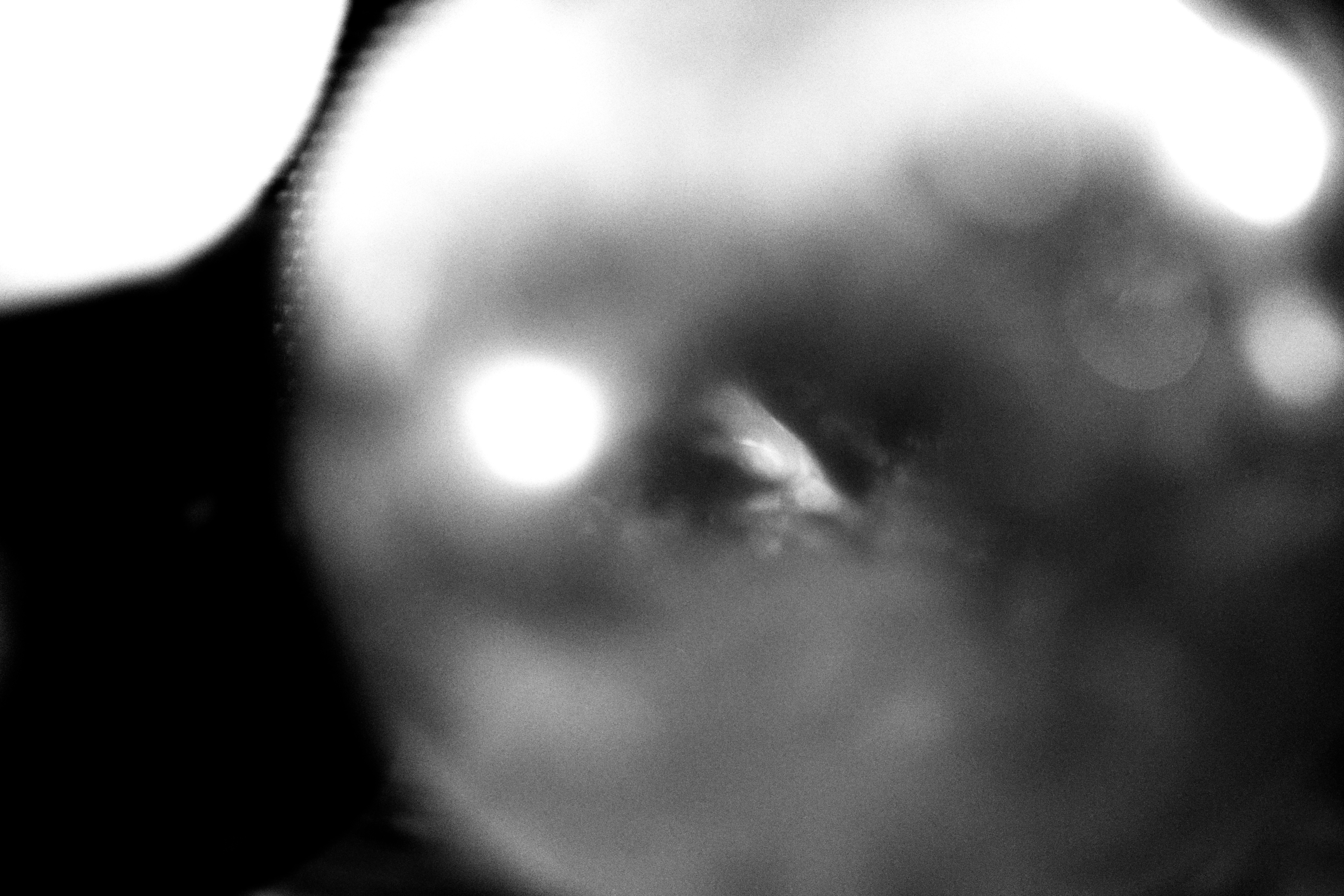 This abstract black and white photograph captures a blurred interplay of light and shadow, evoking a sense of mystery and introspection. The composition creates an intimate yet indistinct glimpse into a face or object, inviting viewers to contemplate the unseen depths behind the obscured visuals. The soft glow from the bright spots contrasts with the murky background, enhancing the enigmatic mood.