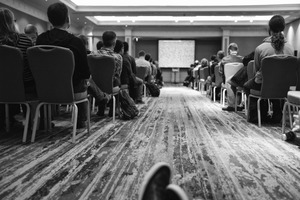 This monochrome photograph captures a sea of seated individuals, all focused intently on a distant screen, creating a sense of collective engagement. The low perspective draws the viewer into the scene, emphasizing the rows of chairs and the carpet's textures, while soft, diffused lighting adds a contemplative mood. The composition highlights the unity and quiet intensity of the crowd in an atmosphere of shared learning.