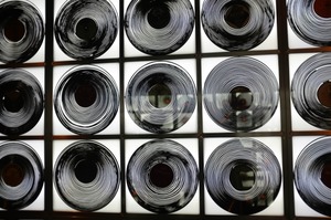 This photograph showcases a grid of vinyl records, arranged in a striking pattern that evokes nostalgia and rhythm. The interplay of black and white creates a visually captivating composition, with soft backlighting enhancing the depth of the curves. The overall mood is both artistic and retro, inviting viewers to reflect on the timeless nature of music and design.