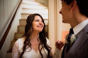 In a warmly lit hallway, a bride in a lace gown shares a moment of laughter with her partner, creating a sense of warmth and intimacy. The soft sunlight streaming through the stairway enhances their joyful expressions, capturing the excitement of a special occasion. The composition frames their interaction beautifully, highlighting their connection amidst the backdrop of a charming domestic setting.