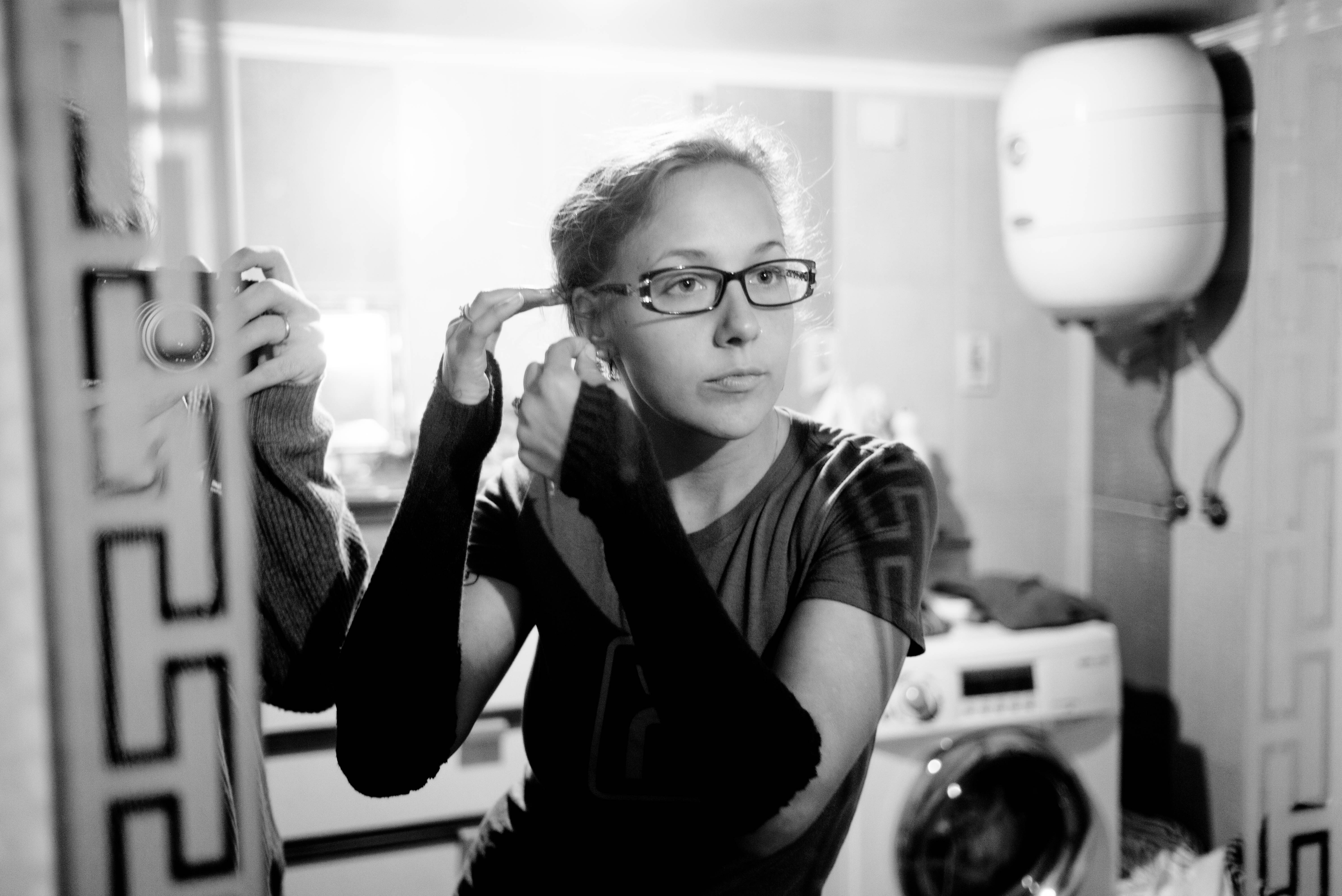 A young woman, captured in thoughtful concentration, adjusts her hair in a softly lit bathroom. The stark contrast of black and white accentuates her delicate features and the reflective surfaces, while the ambient light creates a serene and intimate atmosphere. The juxtaposition of her casual outfit against the mundane backdrop evokes a sense of everyday beauty and introspection.
