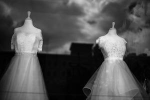 Two elegant wedding dresses stand proudly in a shop window, their delicate lace and flowing tulle illuminated by a soft, diffused light. The moody, overcast sky reflects in the glass, creating a dreamlike atmosphere that evokes nostalgia and romance. The juxtaposition of the dresses against the darkened backdrop enhances their beauty, inviting viewers to imagine the stories and celebrations they encapsulate.