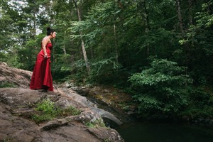 A woman in a striking red dress stands poised on a rocky outcrop, gazing down toward a serene, dark pool nestled among lush greenery. The soft, diffused lighting filters through the trees, casting a magical glow on her figure and enhancing the tranquil yet contemplative mood. The composition draws the eye along the natural lines of the rocks and water, creating a connection between the subject and her tranquil surroundings.