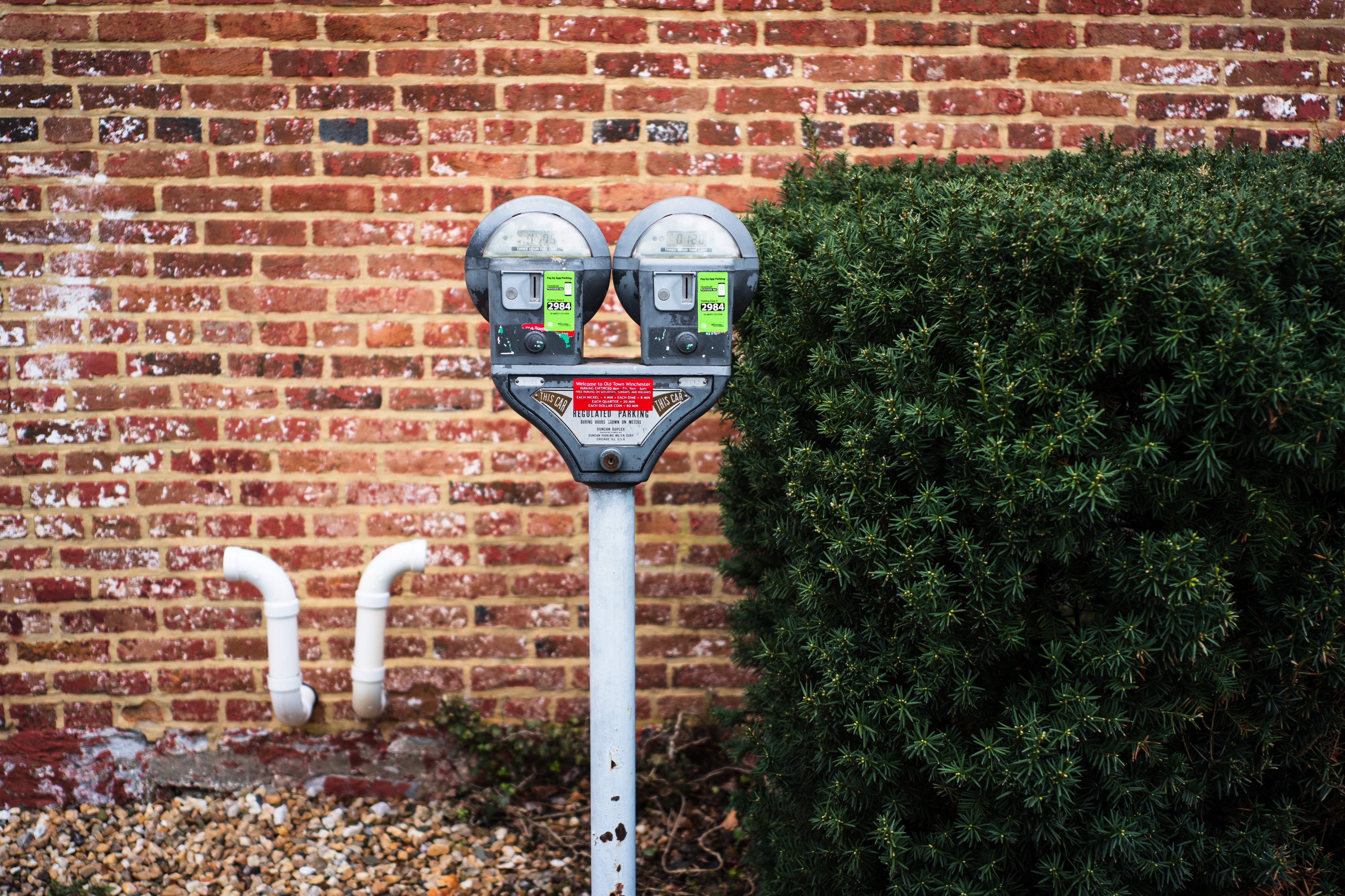 The photograph features two parking meters standing sentinel beside a lush green bush against a backdrop of rustic red brick. The muted colors and soft lighting convey a sense of quiet isolation, hinting at the passage of time in an often bustling urban setting. The composition balances man-made elements with nature, inviting viewers to ponder the stories hidden within this everyday scene.
