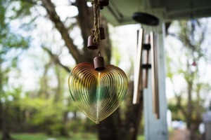 A delicately crafted heart-shaped ornament dangles in the foreground, showcasing intricate swirling patterns that catch the light. The soft blur of green foliage in the background creates a serene, inviting atmosphere, while the natural light enhances the vibrant colors of the decoration. The mood is tranquil and contemplative, evoking a sense of calm and harmony with nature.