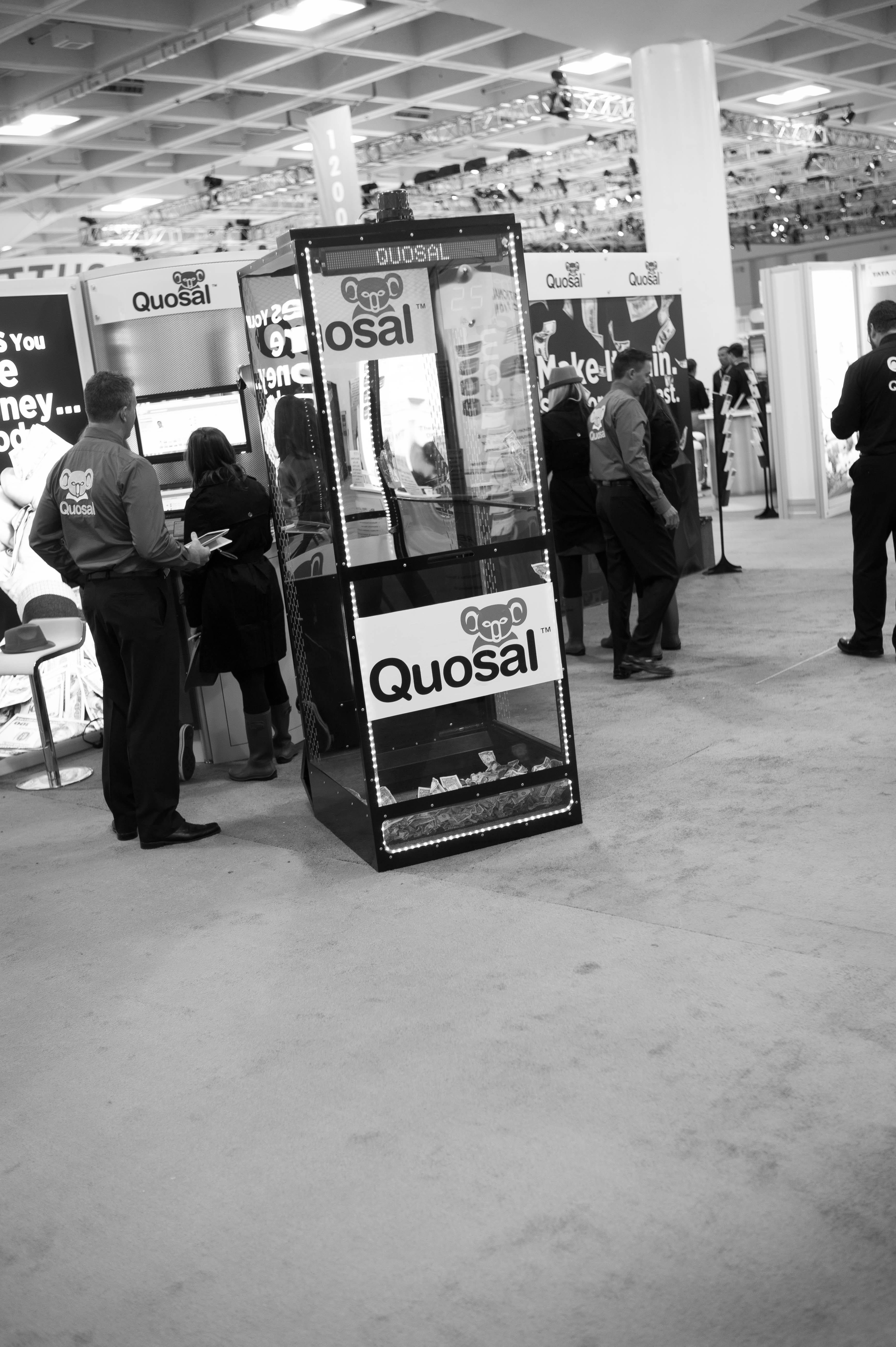 The photograph captures a busy exhibition space, dominated by a prominent display booth labeled 'Quosal.' The monochrome palette adds a nostalgic yet professional mood, highlighting the energetic interactions of attendees as they cluster around the booth in conversation and curiosity, with soft lighting illuminating the exhibitors.