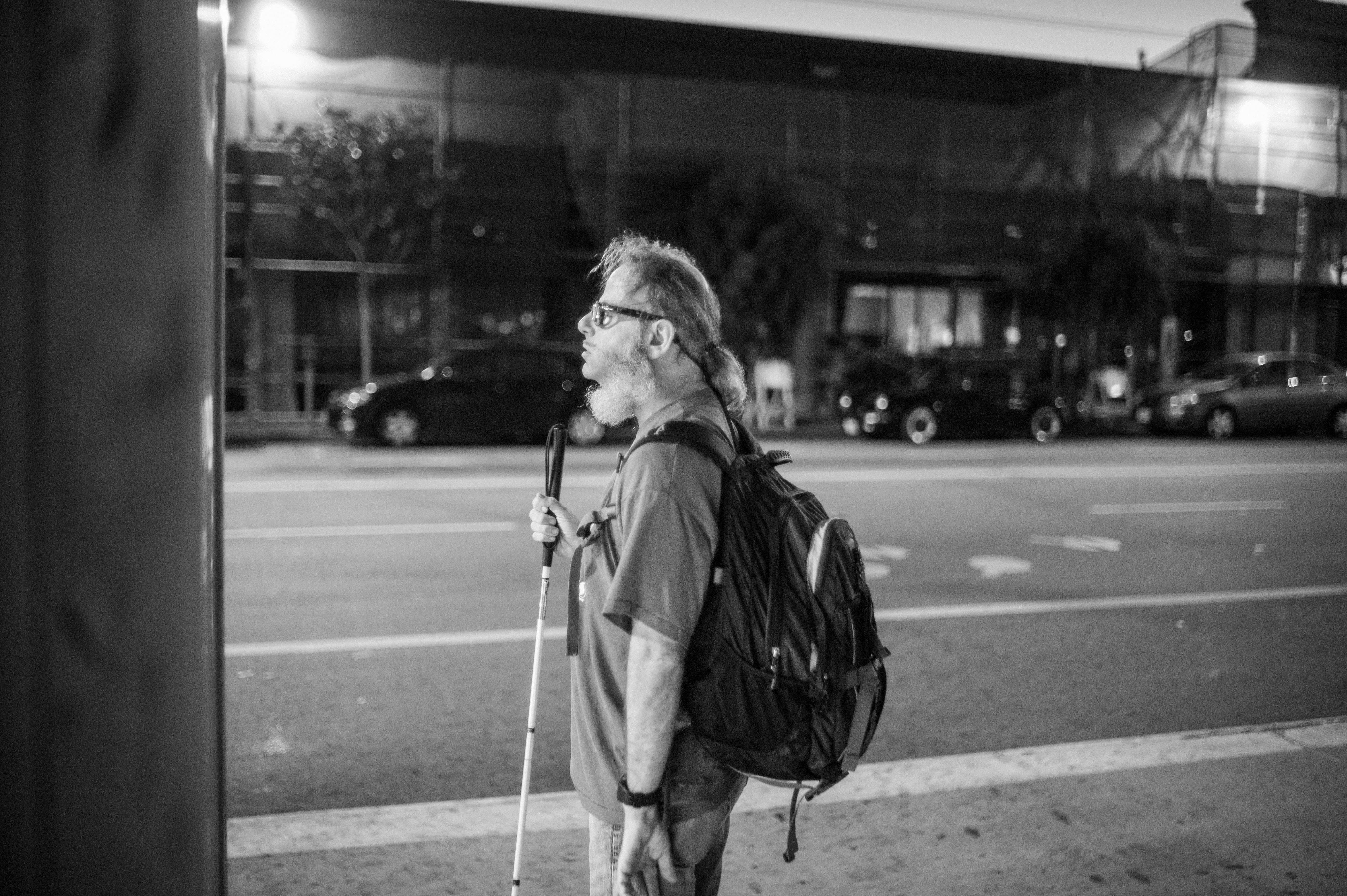 A solitary figure stands at a street corner, bathed in the dim glow of early evening light. His expression conveys a mix of hope and uncertainty as he awaits transportation, while the surrounding darkness enhances the mood of contemplation. The composition juxtaposes his presence against the blurred backdrop of city life, hinting at stories untold in the fading light.