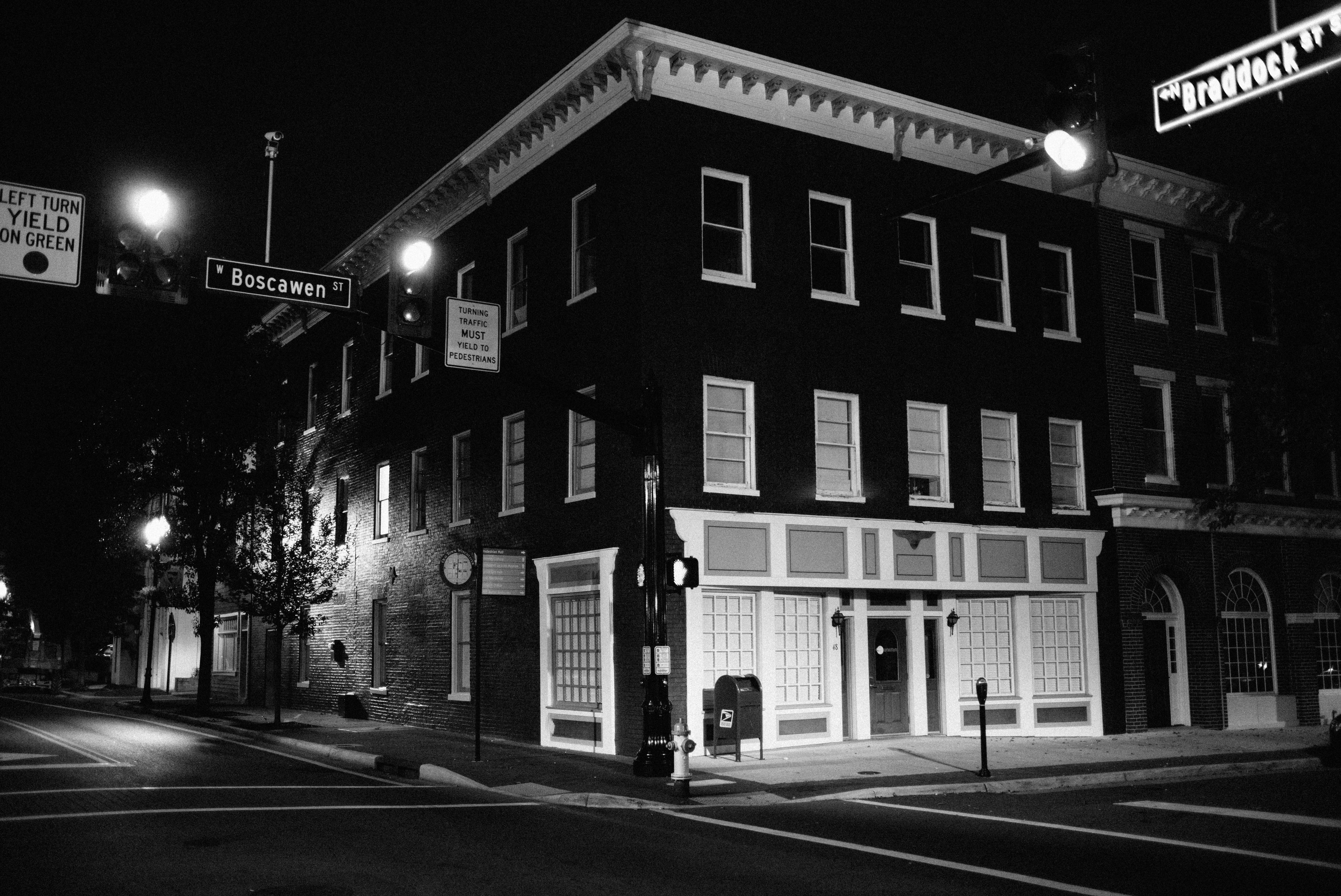 A vintage brick building stands stoically under the veil of night, bathed in the stark contrast of black and white. Street signs and a solitary traffic light cast an eerie glow, enhancing the desolate mood permeating the scene. The composition captures an unsettling stillness, inviting curiosity about the stories hidden within its walls.