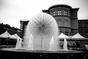 A striking fountain in the foreground resembles a delicate dandelion, its water sprays capturing the surrounding atmosphere. The monochrome palette enhances the dramatic mood, while the soft, diffused light creates a serene ambiance amidst the architectural backdrop. Contrasting textures and shapes bring depth to the composition, inviting contemplation and tranquility.