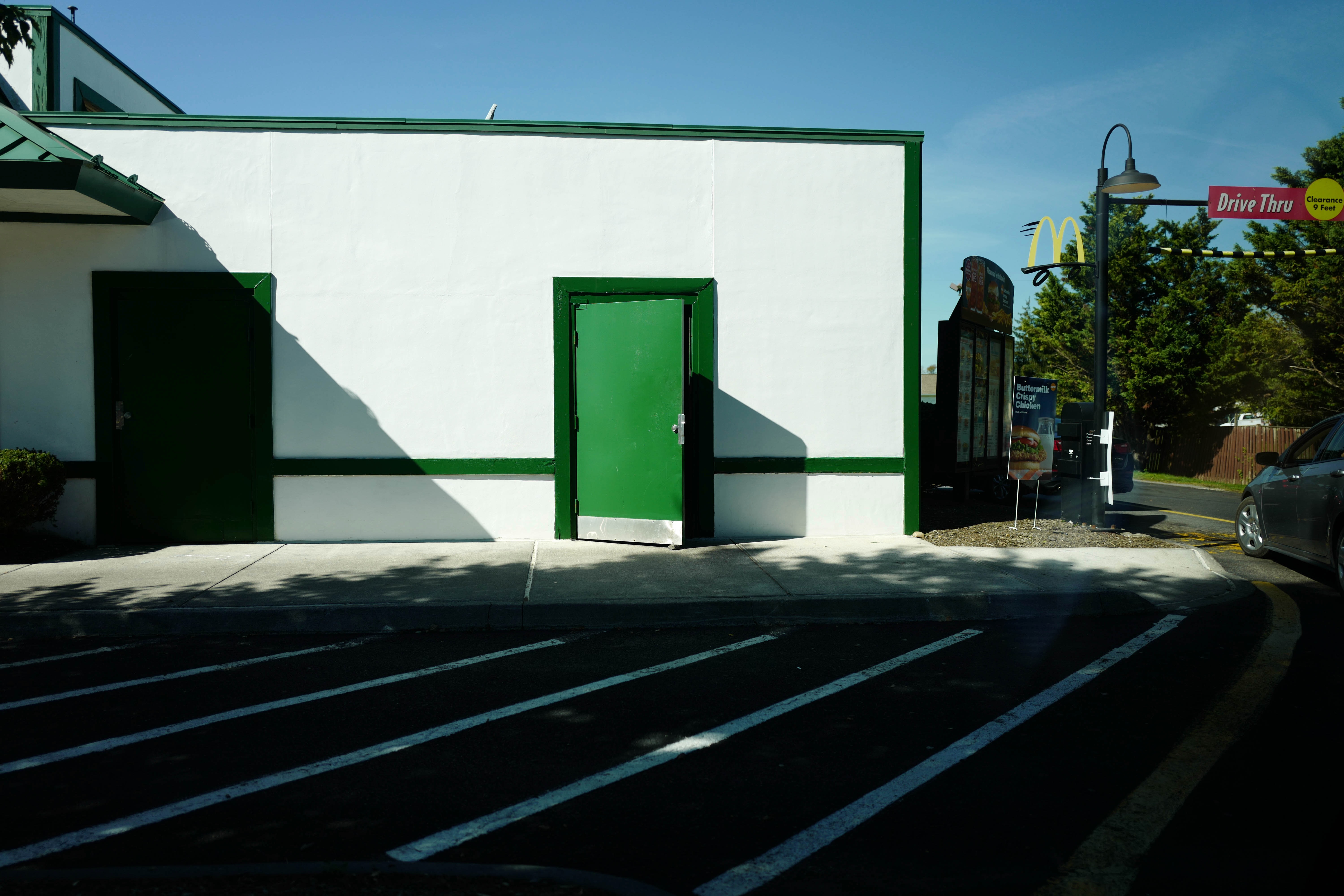 The photograph captures the stark contrast between a minimalist white wall adorned with vibrant green doors and the surrounding parking lot, leading to a drive-thru sign in the background. Bright daylight casts sharp shadows, enhancing the structural lines and creating a sense of order amidst the casual setting of a fast-food restaurant. The composition emphasizes simplicity and symmetry, evoking a mood of quiet anticipation as patrons approach their next meal.