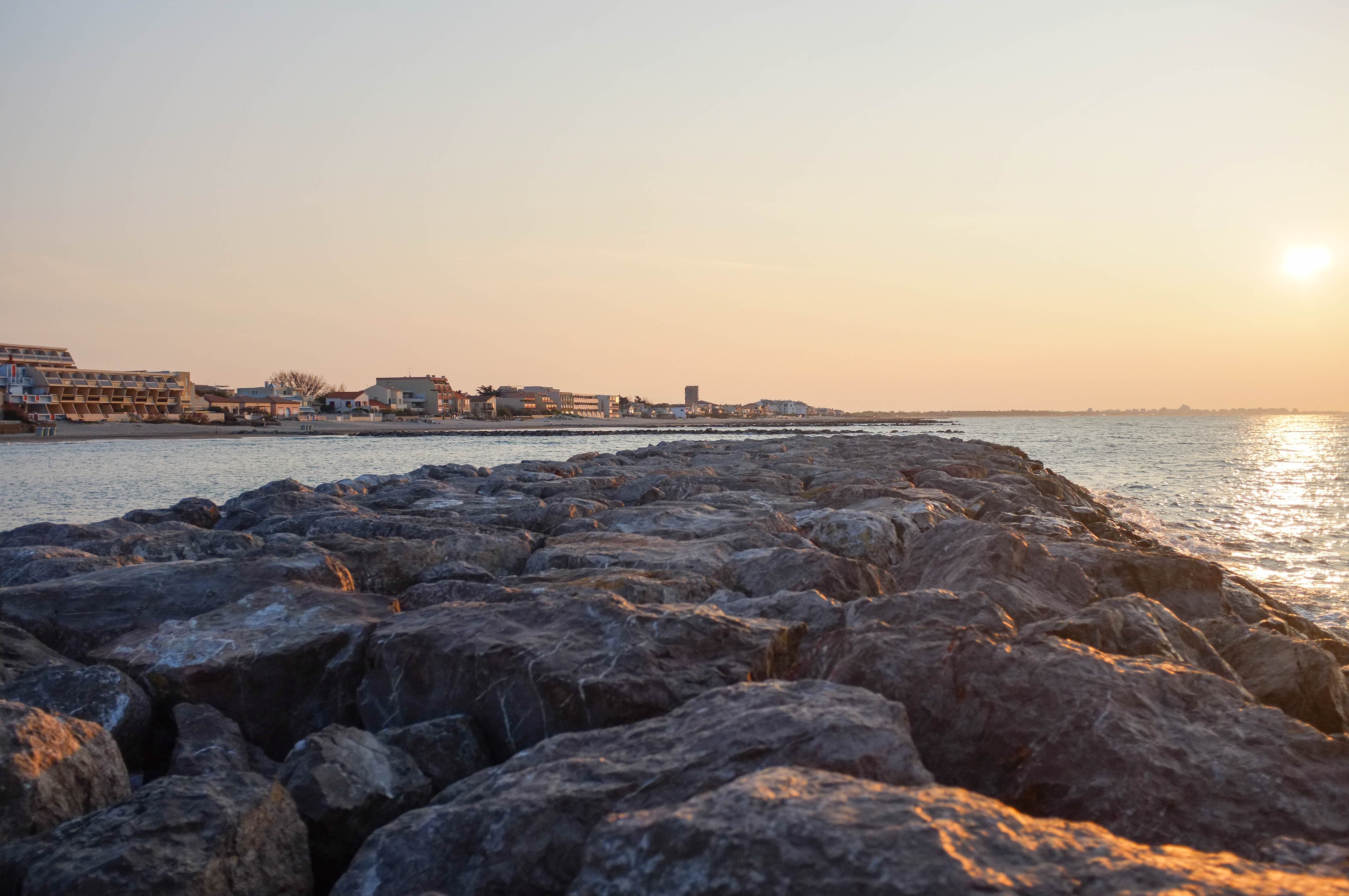 This photograph captures a tranquil shoreline at sunset, where a rugged jetty of stones leads into the shimmering water. The soft, golden light of the setting sun bathes the landscape, creating a serene and contemplative mood. In the background, the silhouettes of buildings fade into the horizon, enhancing the sense of calm and inviting reflection.