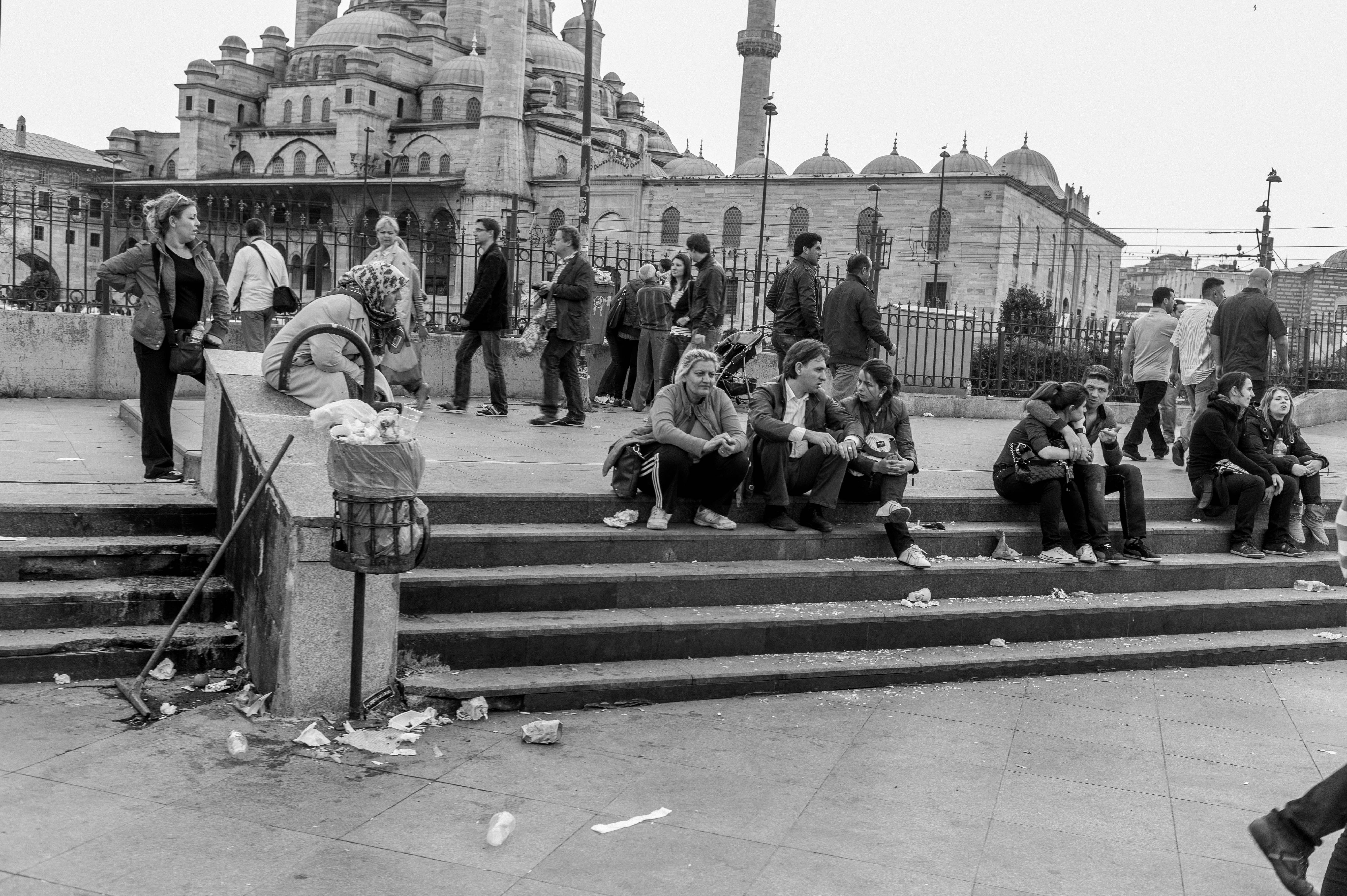 The photograph captures a bustling urban scene in black and white, where groups of people engage in various activities on a set of steps. The stark contrast of the lighting highlights the intricate architecture of a grand mosque in the background, creating a sense of depth and solemnity. Amidst the lively chatter, a feeling of intimacy and community weaves through the otherwise chaotic environment.