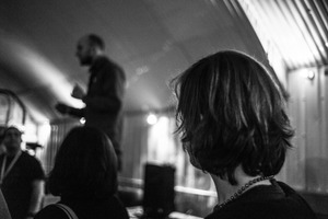 In a dimly lit space, a speaker stands confidently, engaging an unseen audience. The focus shifts to a figure in the foreground, their contemplative profile framed against the backdrop of a warm interior, creating an atmosphere of connection and thoughtful reflection. The monochromatic tones heighten the mood, capturing a moment of shared experience and connection amidst the intimate setting.