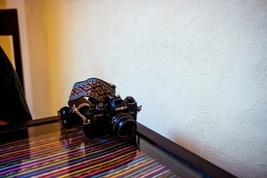 A vintage camera rests on a vibrant, striped tablecloth, creating a warm and inviting atmosphere. The soft, diffused lighting accentuates the textures of both the camera and the fabric, evoking a sense of nostalgia. The simplicity of the composition draws the viewer's eye to the subject, suggesting moments yet to be captured and memories waiting to be made.