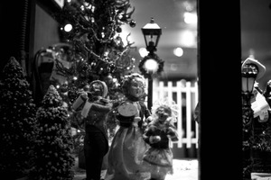 The photograph captures a charming holiday display featuring vintage figurines against the backdrop of a decorated Christmas tree. The black and white tones enhance the nostalgic mood, bringing a sense of timelessness to the playful scene. Soft lighting highlights the details of the figures, creating a warm allure amidst the wintry setting.
