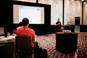 In a softly lit conference room, an engaged audience watches a presenter deliver insights from the front. The foreground captures a person in a bright red shirt, their back turned towards the viewer, focusing intently on the screen with muted tones creating a professional yet inviting atmosphere. The composition highlights the contrast between the speaker and the attendees, emphasizing a sense of learning and collaboration.