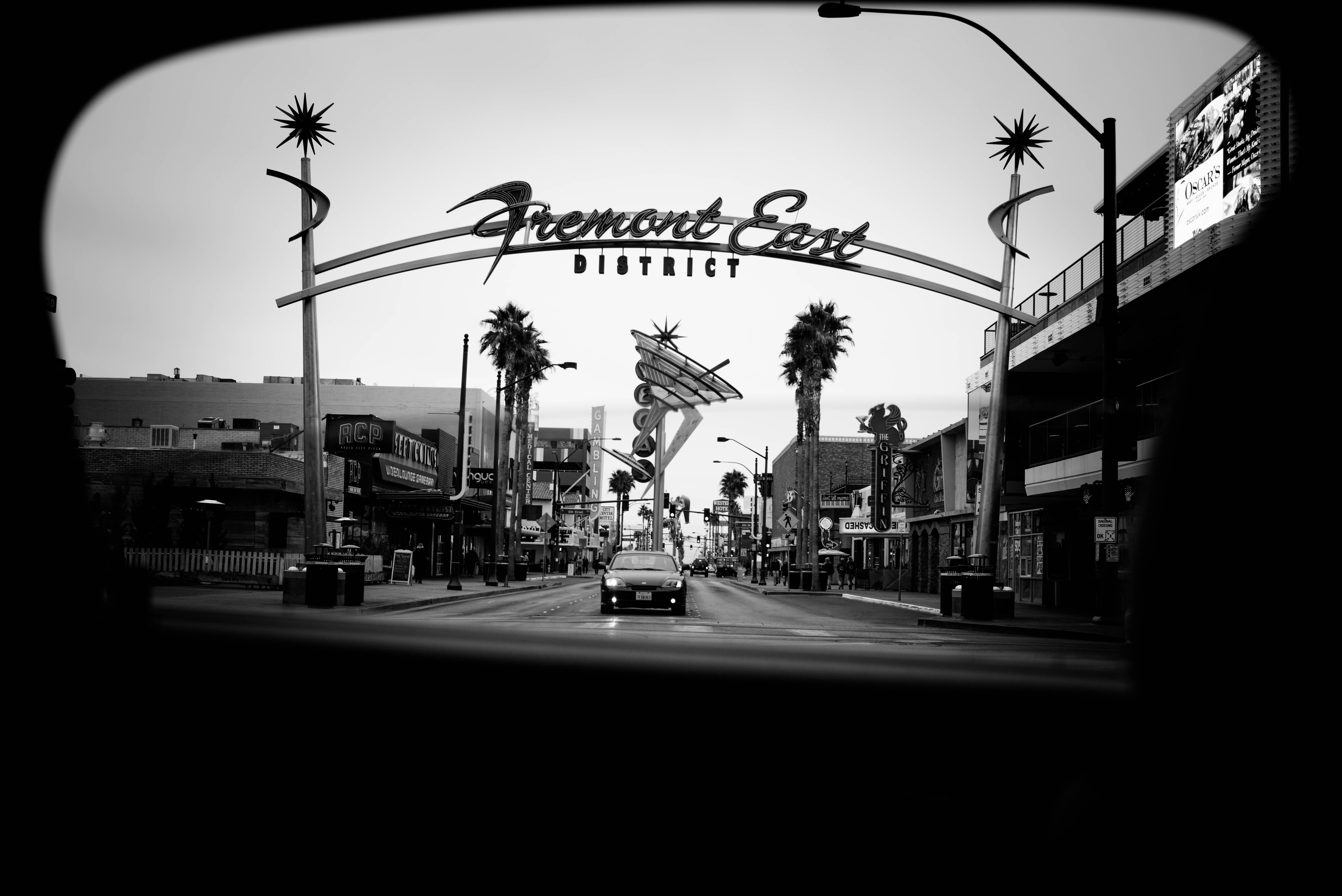 The photograph captures a view of the Fremont East District, framed by the iconic archway, creating a nostalgic urban panorama. The black and white treatment imbues the scene with a timeless quality, while the palm trees and vintage signage evoke a sense of history and charm. Soft lighting accentuates the details, inviting the viewer to reflect on the vibrant life pulsing through this iconic locale.