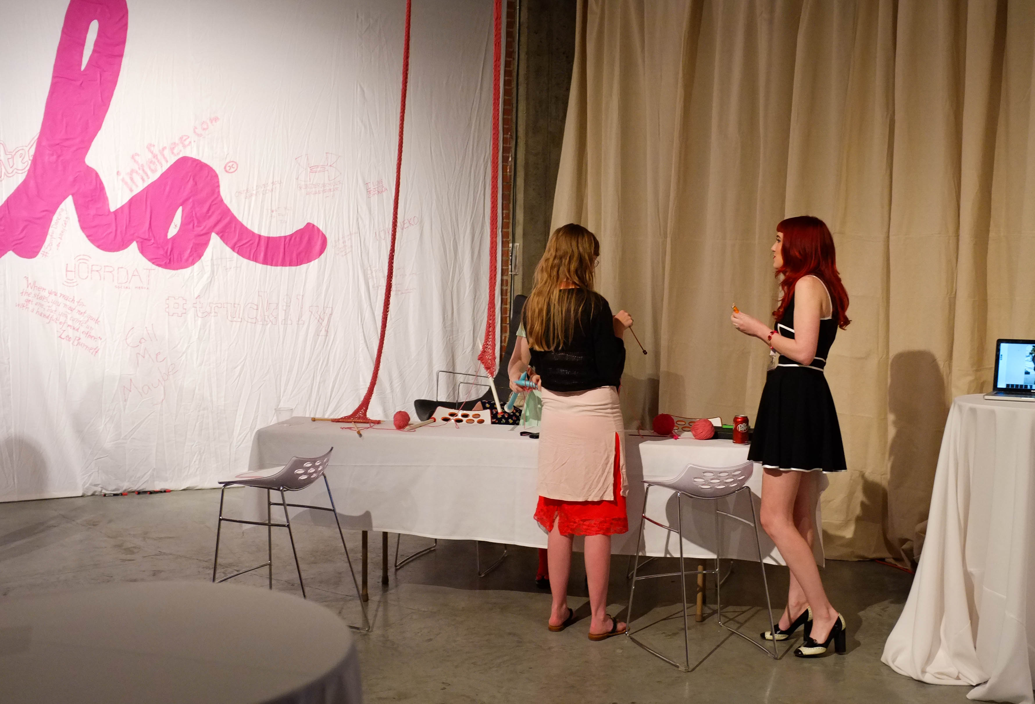 In a cozy, artfully decorated space, two women converse animatedly by a table adorned with colorful craft supplies. The playful ambiance is highlighted by the bold pink 'ha' mural in the background, contrasting with the soft lighting that creates a warm, inviting mood. The composition captures the essence of creativity and collaboration, drawing the viewer into this intimate moment of inspiration and friendship.